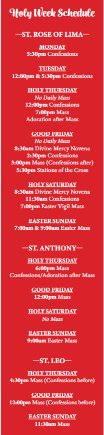 During Lent, we are called to pray, fast, and give alms. St. Rose of Lima CCW is once again sponsoring collecting monetary donations this Lent that will go toward the St. Rose Cookie Jar (emergency funds for those in need) and the Care and Share Food Pantry. The Lenten Almsgiving tree will be set up beginning Ash Wednesday and will continue through Palm Sunday. You can take an envelope off the tree in the back of the church and return it with your donation either in the collection basket or to the parish office anytime between Ash Wednesday and Palm Sunday. Please make checks payable to St. Rose and write “Lenten Almsgiving” in the Memo line. Thank you for your generosity this Lent.